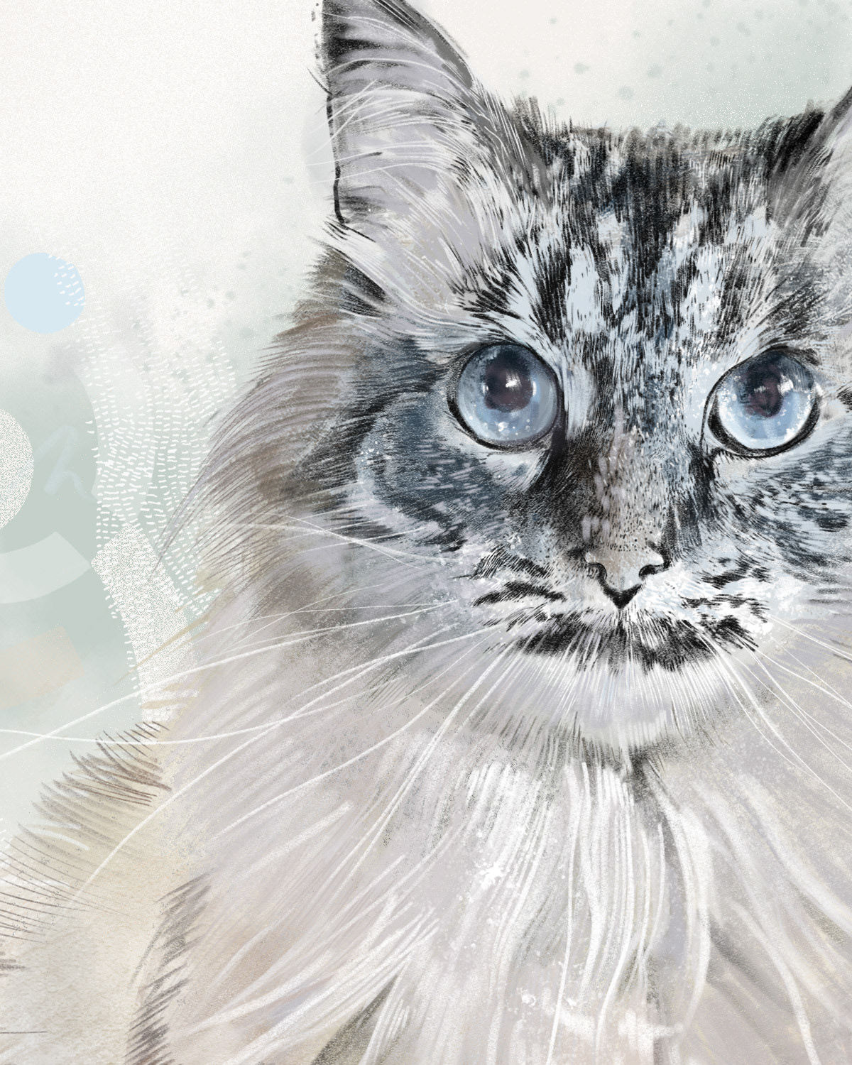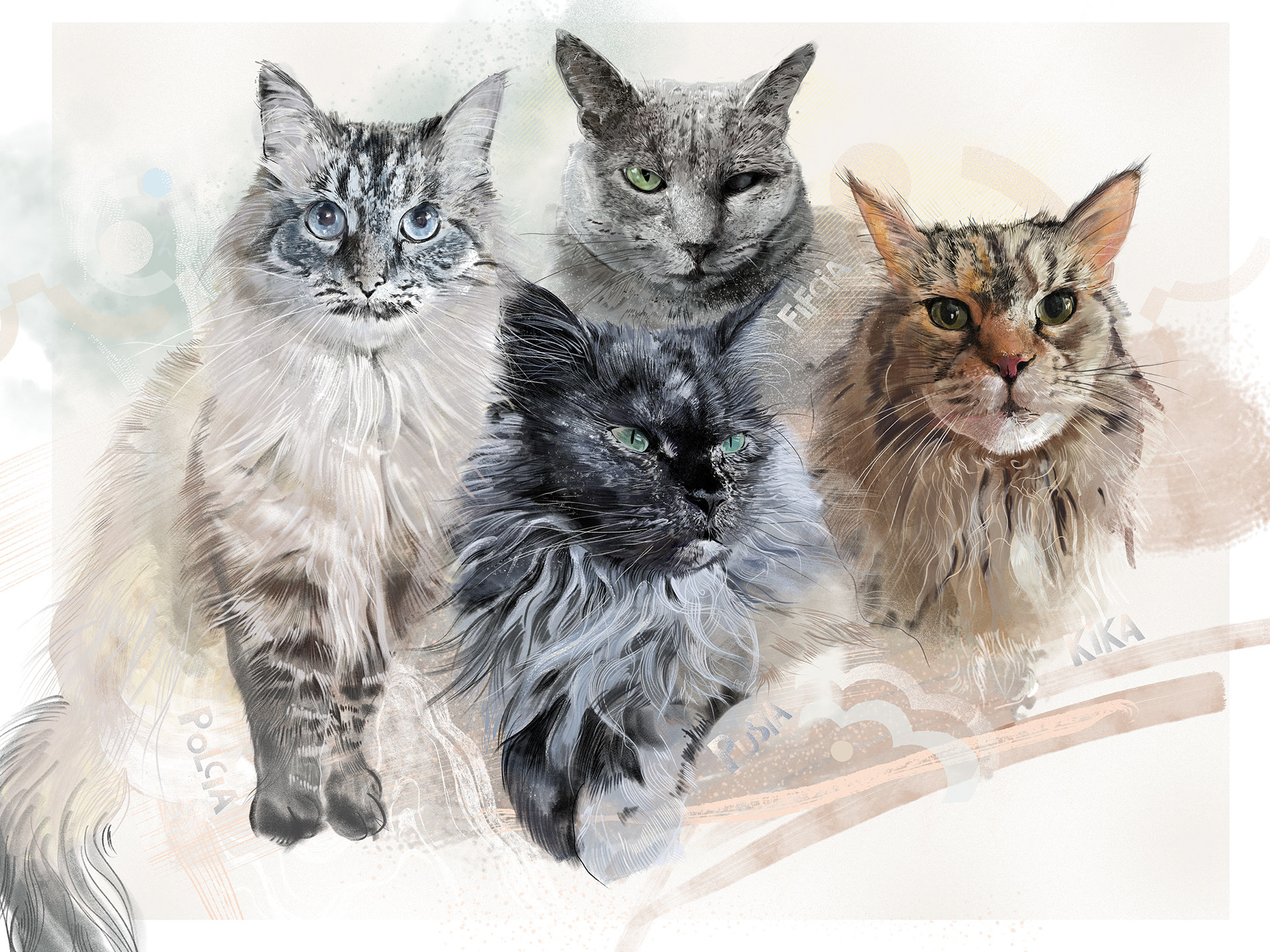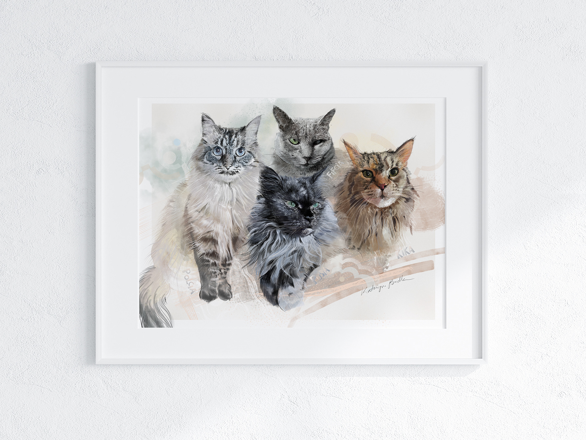 Rysuje portrety zwierzaków na zamówienie. Poznajcie cztery kotki. Każdy portret to połączenie tradycyjnego rysunku na papierze z cyfrowym szkicem na iPad Pro – dzięki temu ma swój niepowtarzalny charakter.