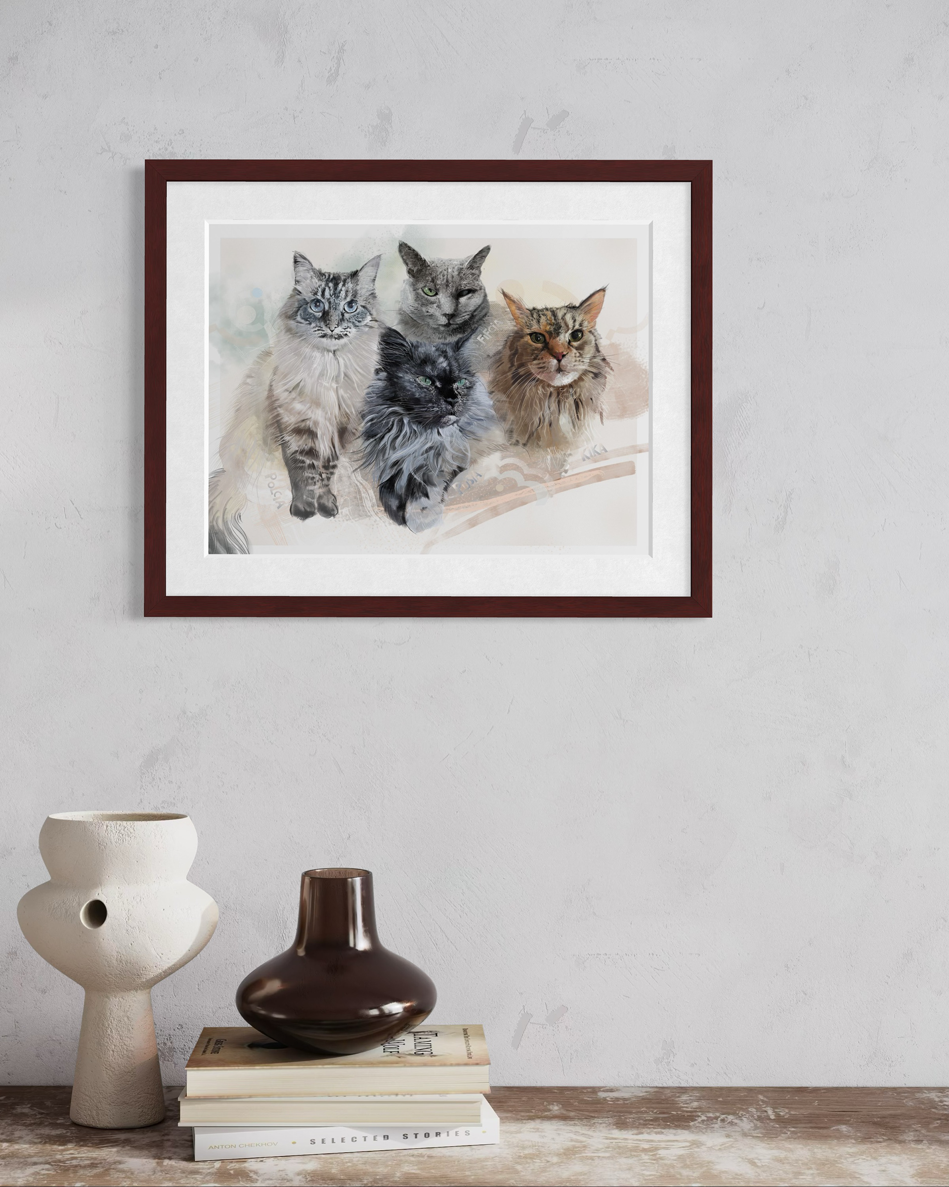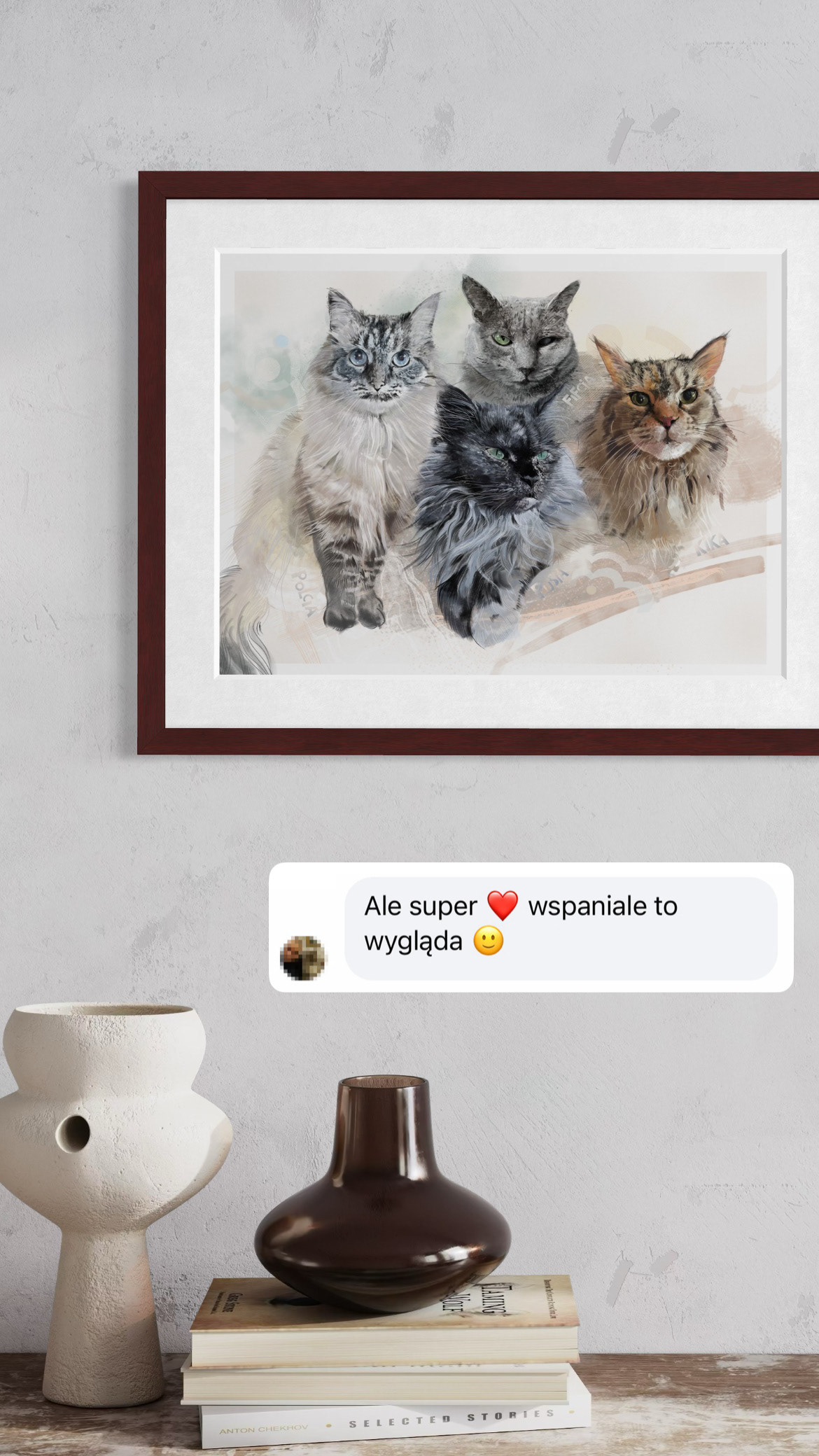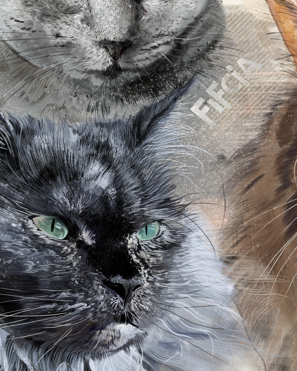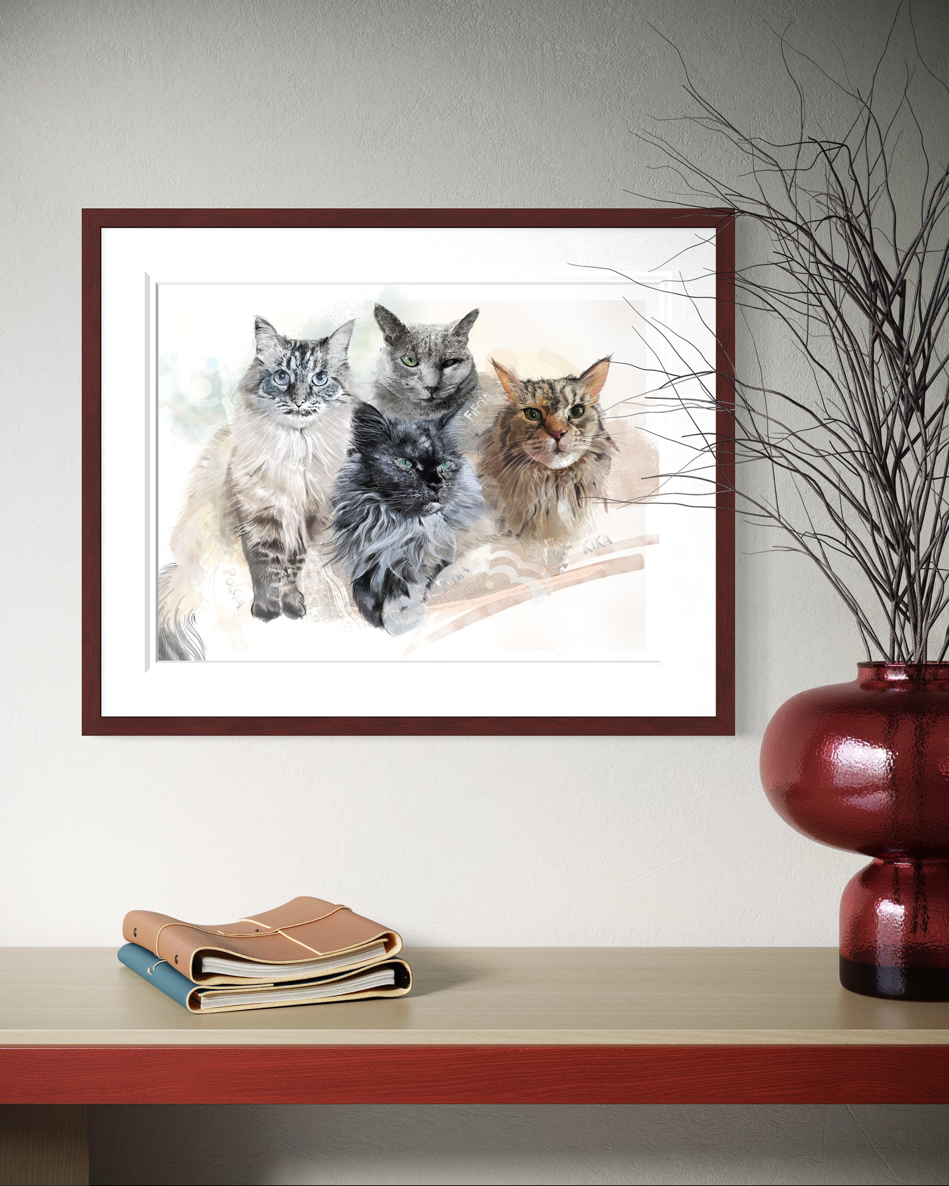 Rysuje portrety zwierzaków na zamówienie. Poznajcie cztery kotki. Każdy portret to połączenie tradycyjnego rysunku na papierze z cyfrowym szkicem na iPad Pro – dzięki temu ma swój niepowtarzalny charakter.