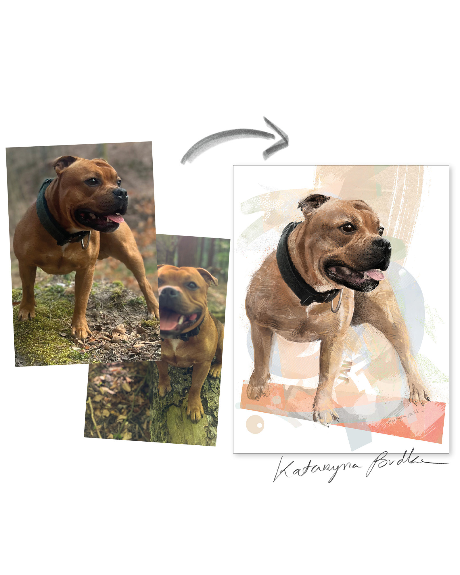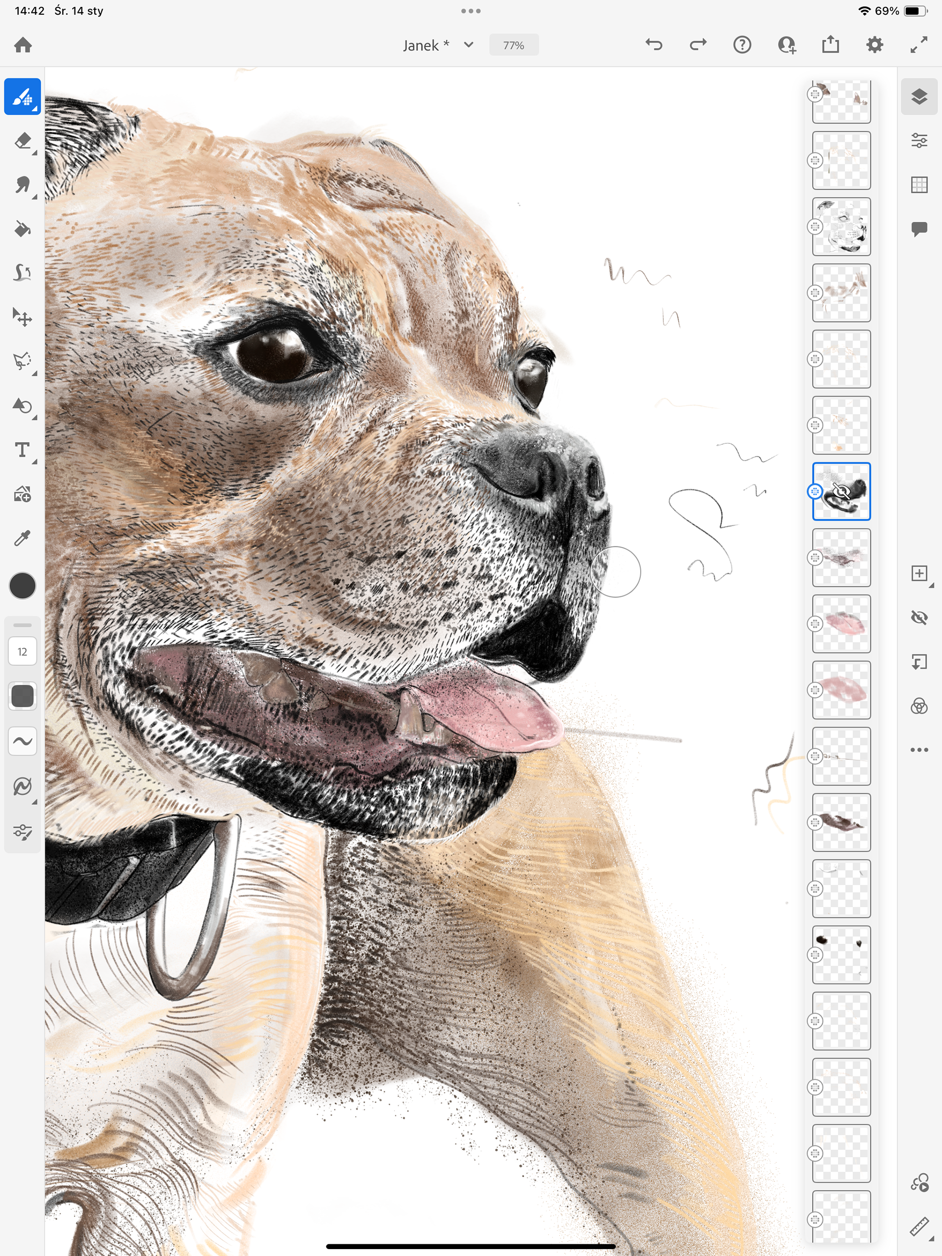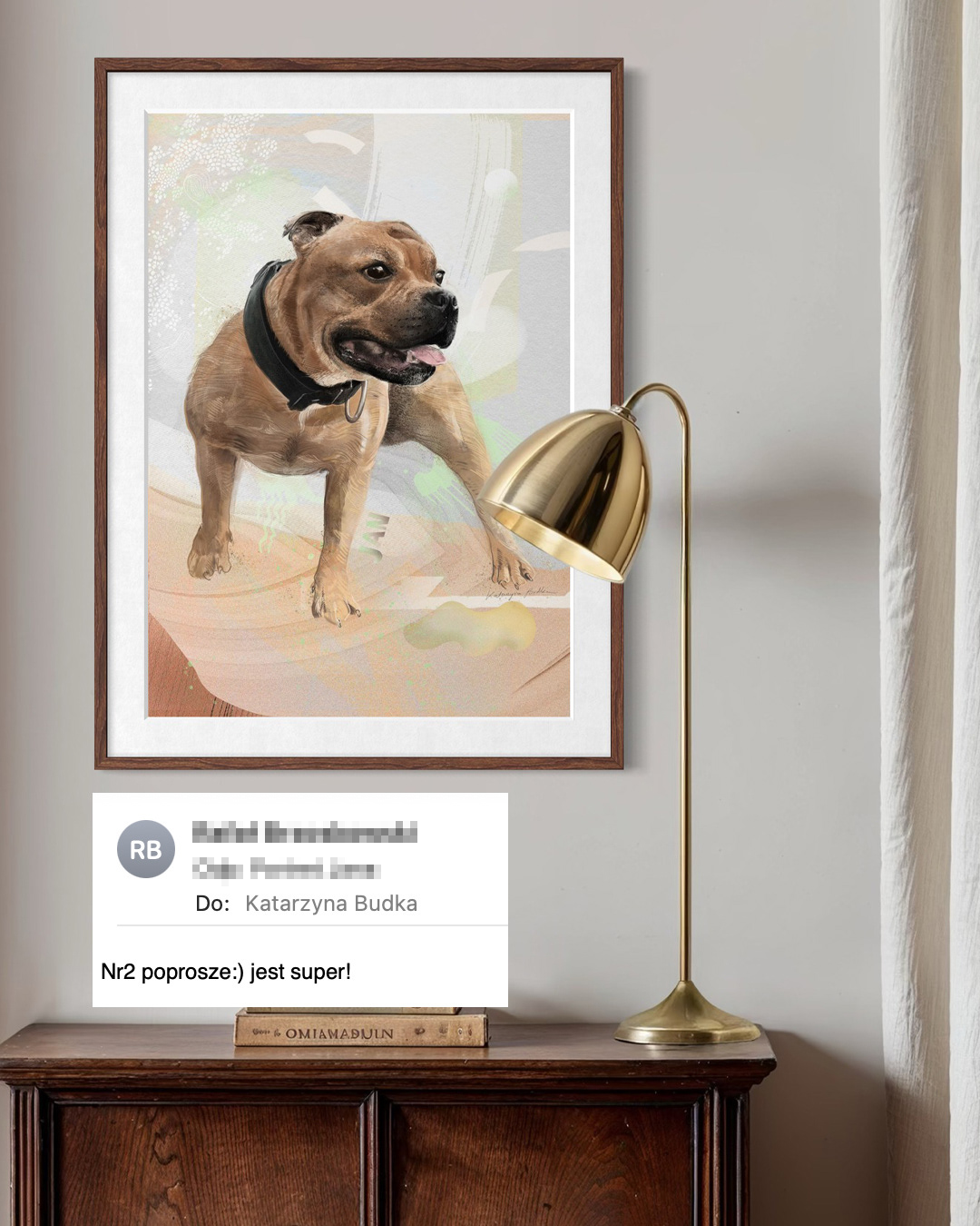 Rysuje portrety zwierzaków na zamówienie. Poznajcie pieska o imieniu Janek. Każdy portret to połączenie tradycyjnego rysunku na papierze z cyfrowym szkicem na iPad Pro – dzięki temu ma swój niepowtarzalny charakter.