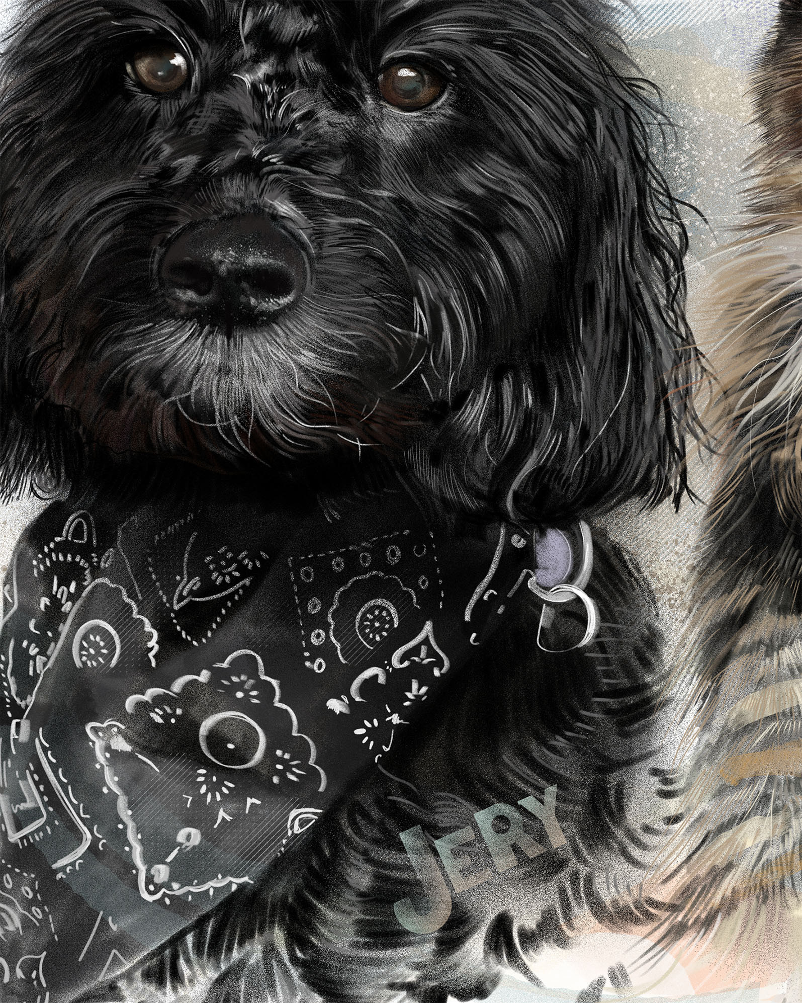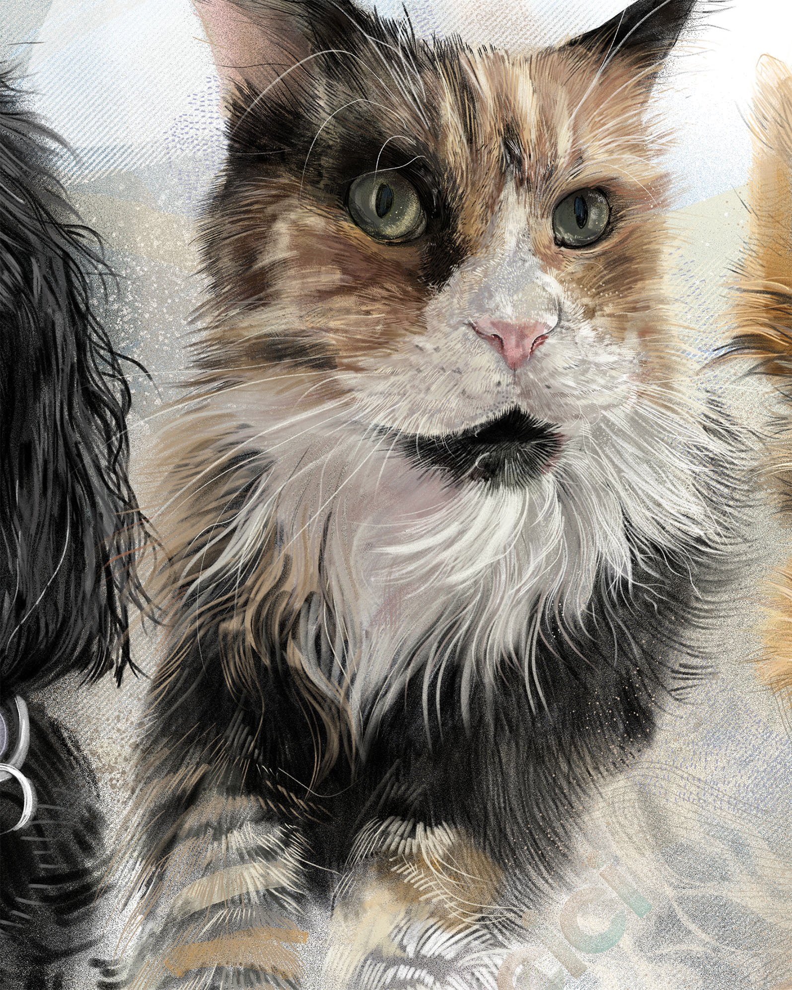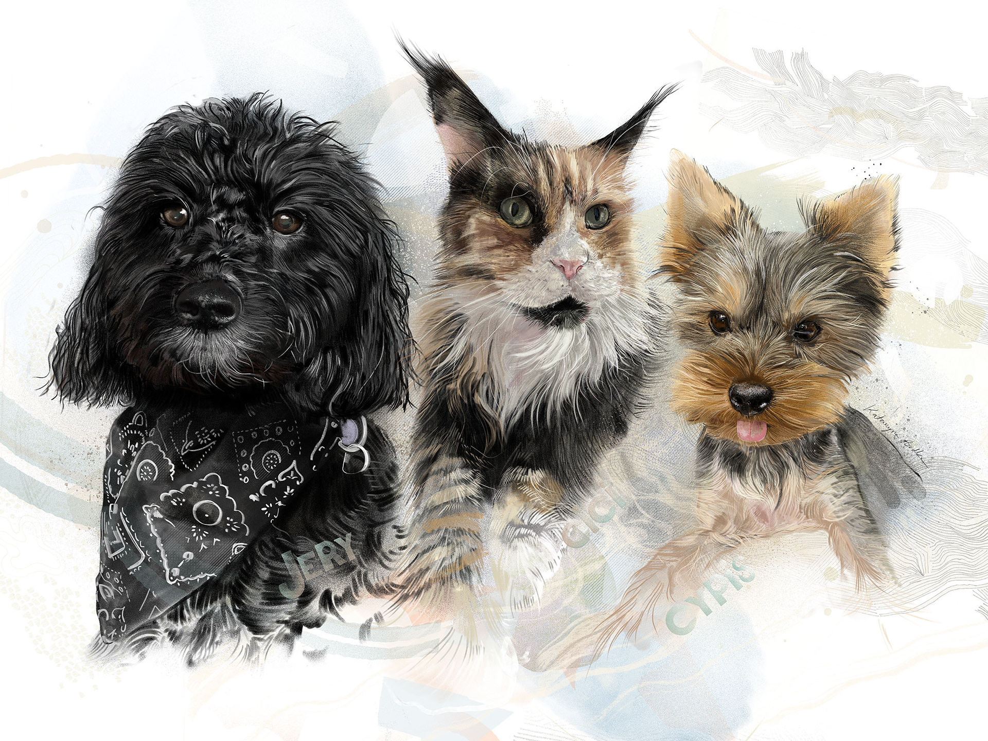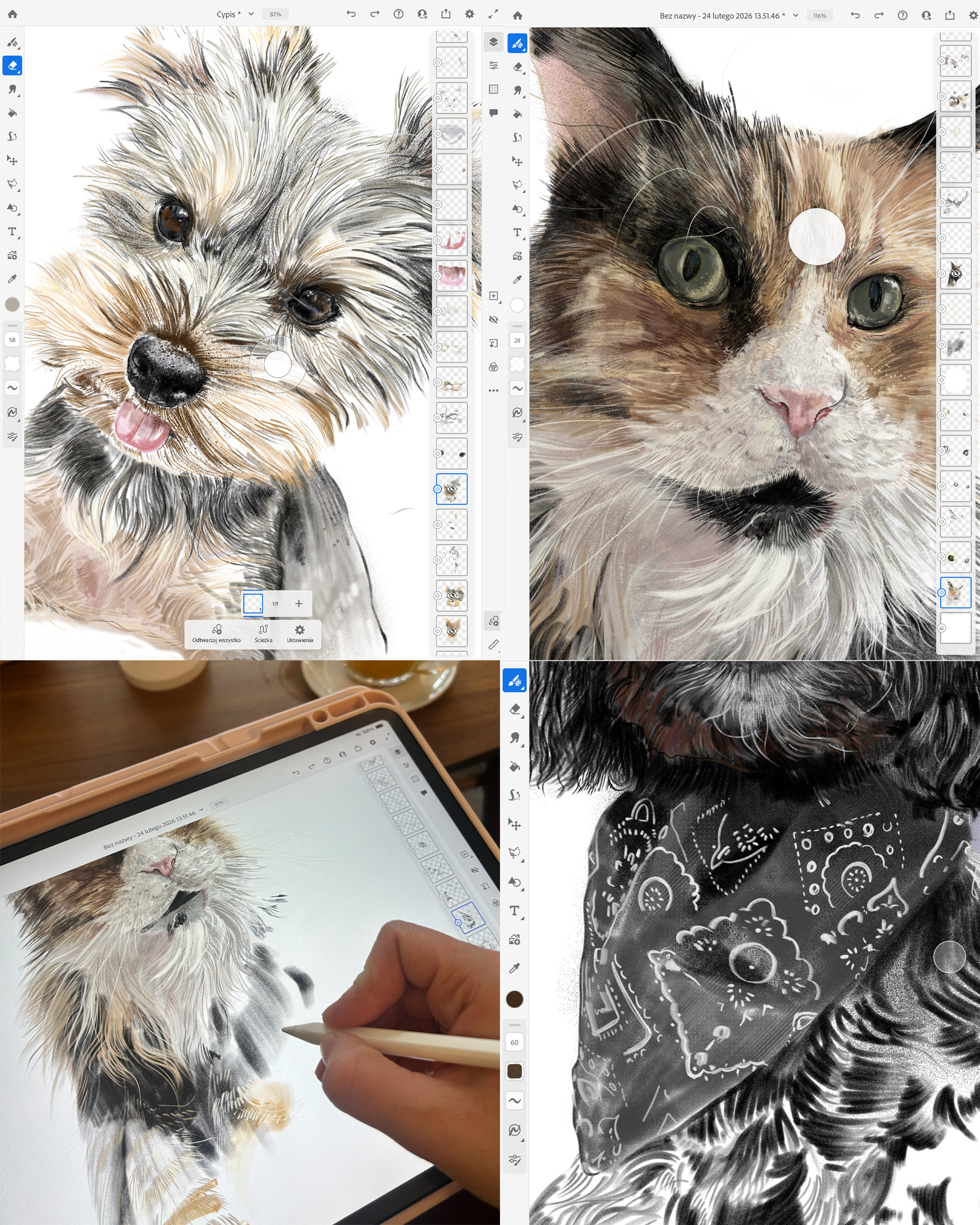 Rysuję portrety zwierzaków na zamówienie. Poznajcie trzech zwierzęcych przyjaciół. Każdy portret to połączenie tradycyjnego rysunku na papierze z cyfrowym szkicem na iPad Pro – dzięki temu ma swój niepowtarzalny charakter.