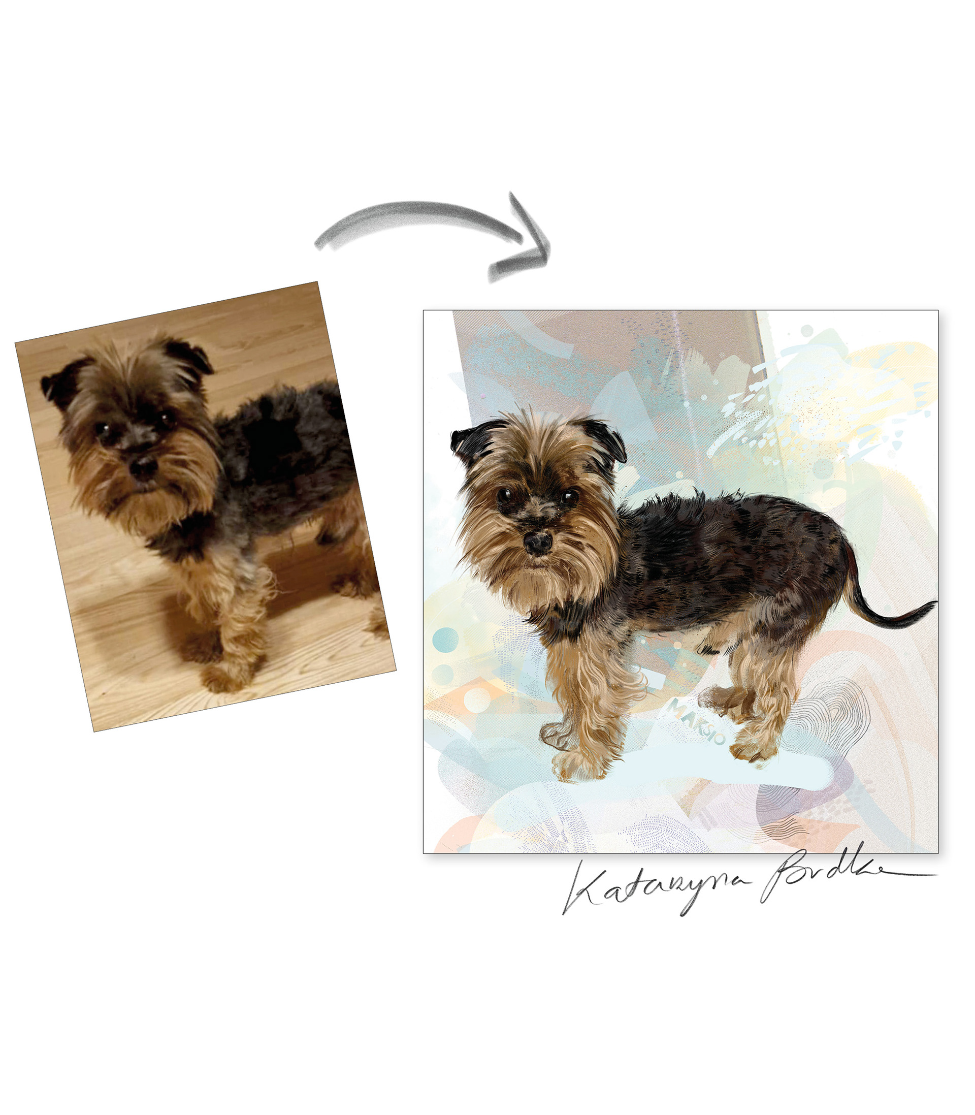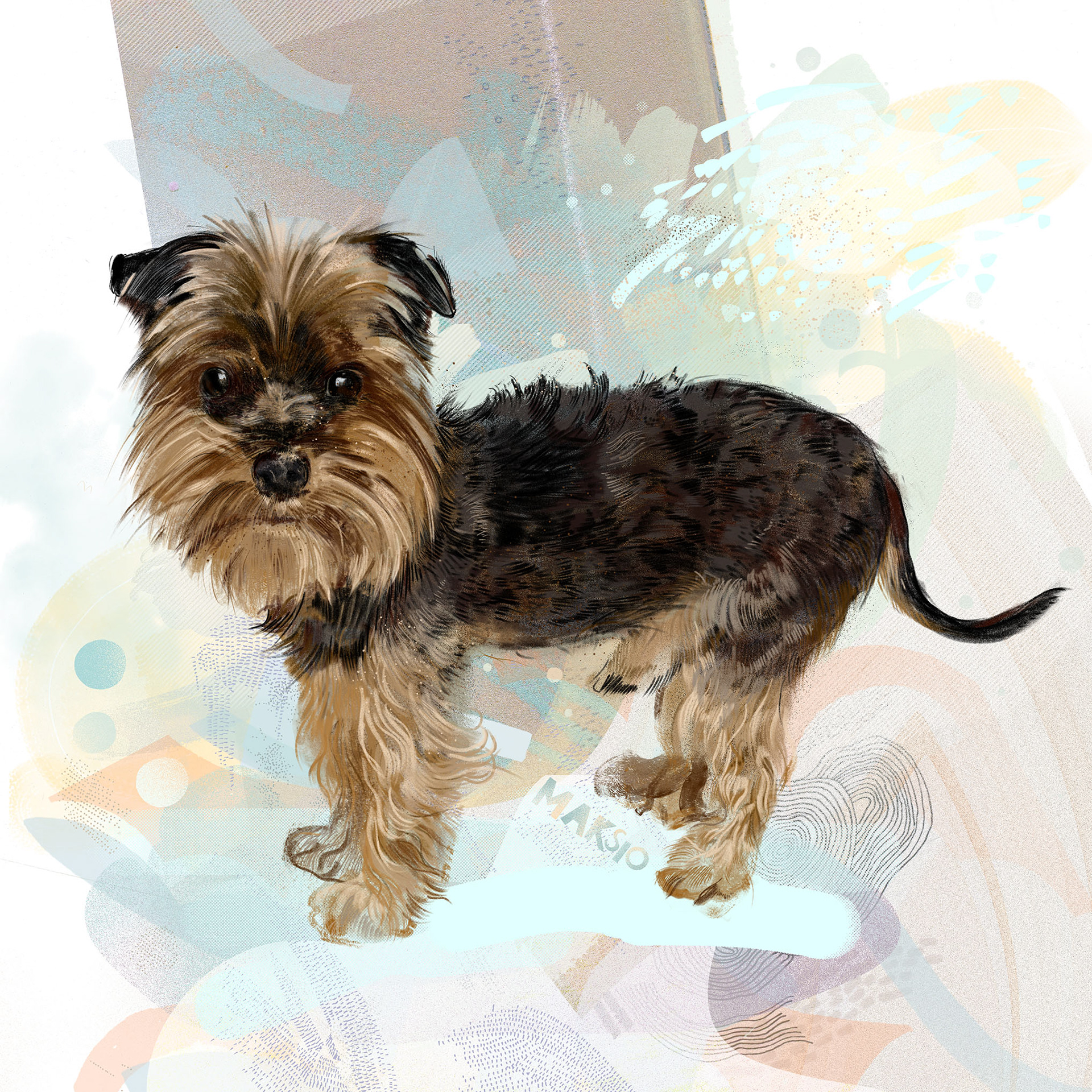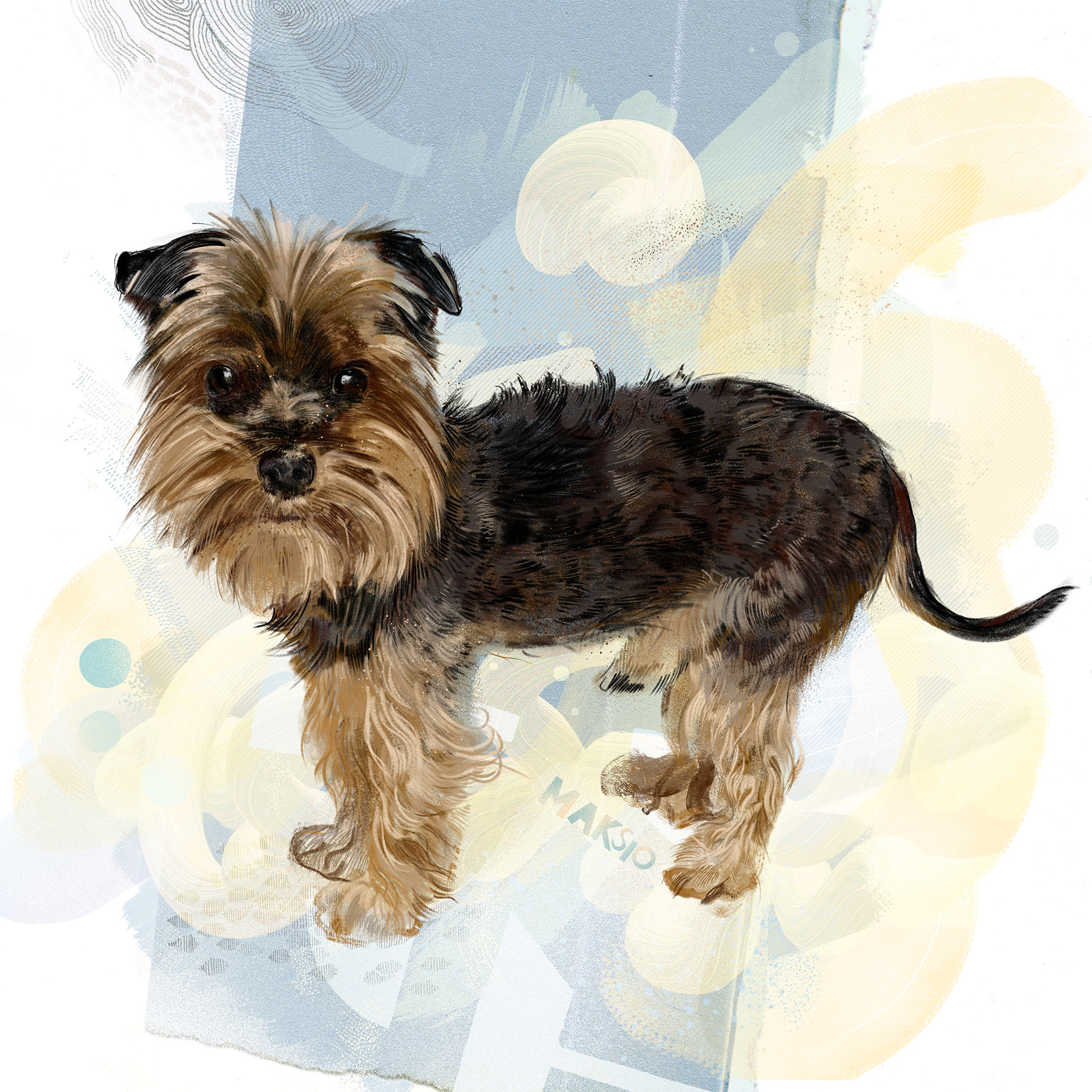 Rysuje portrety zwierzaków na zamówienie. Poznajcie pieska o imieniu Maksio. Każdy portret to połączenie tradycyjnego rysunku na papierze z cyfrowym szkicem na iPad Pro – dzięki temu ma swój niepowtarzalny charakter.